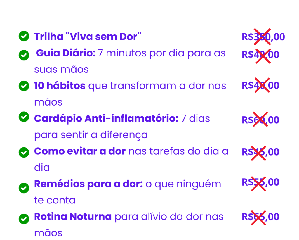 No total, isso tudo deveria custar R$655,00. Mas hoje, você vai ter acesso ao Protocolo Mão SemDor por apenas: