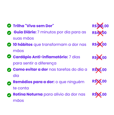 No total, isso tudo deveria custar R$655,00. Mas hoje, você vai ter acesso ao Protocolo Mão SemDor por apenas:
